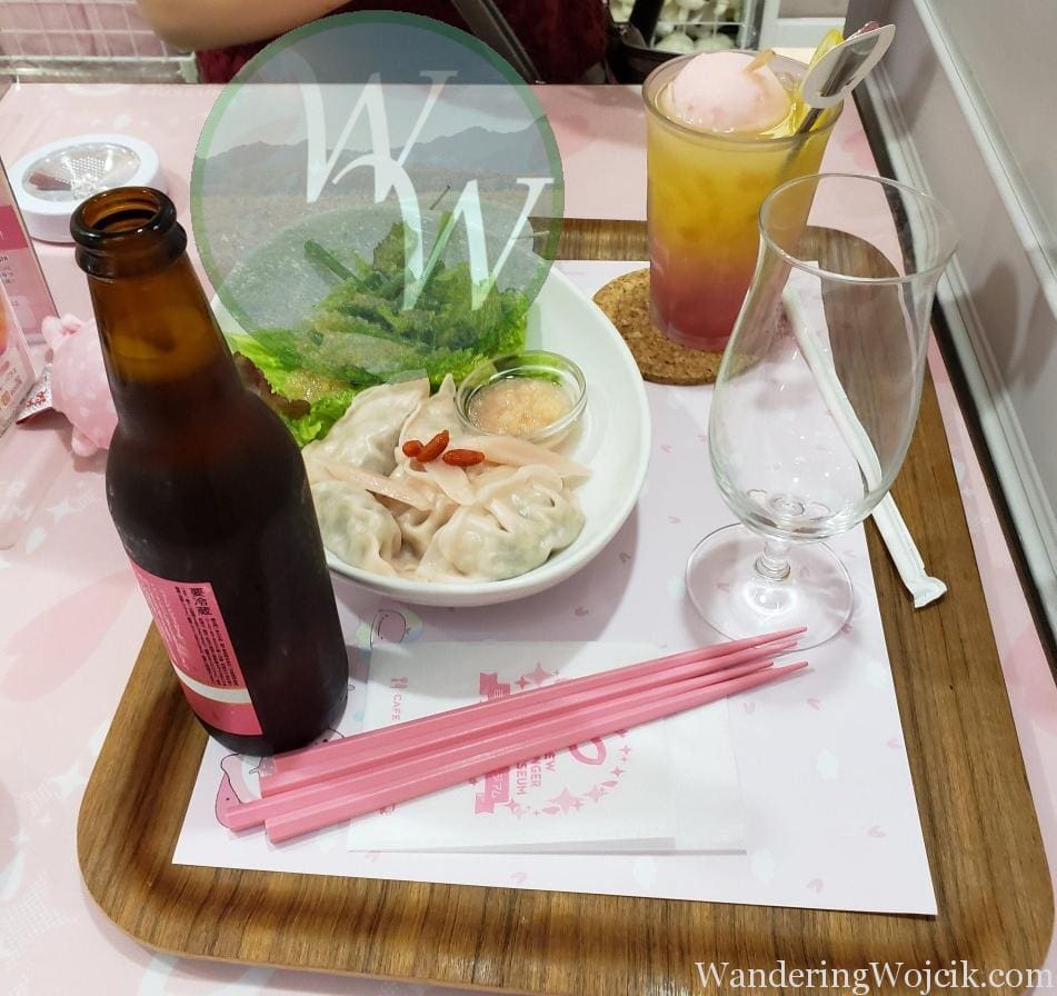 I opted for a ginger beer while my fiancée went with a ginger soda float. The float had the frozen dessert part in the shape of a whale shark (a character I think they were doing a collaboration with at the time). We both decided to share a helping of gyoza (pot stickers) and salad. Did I mention everything was loaded with ginger?