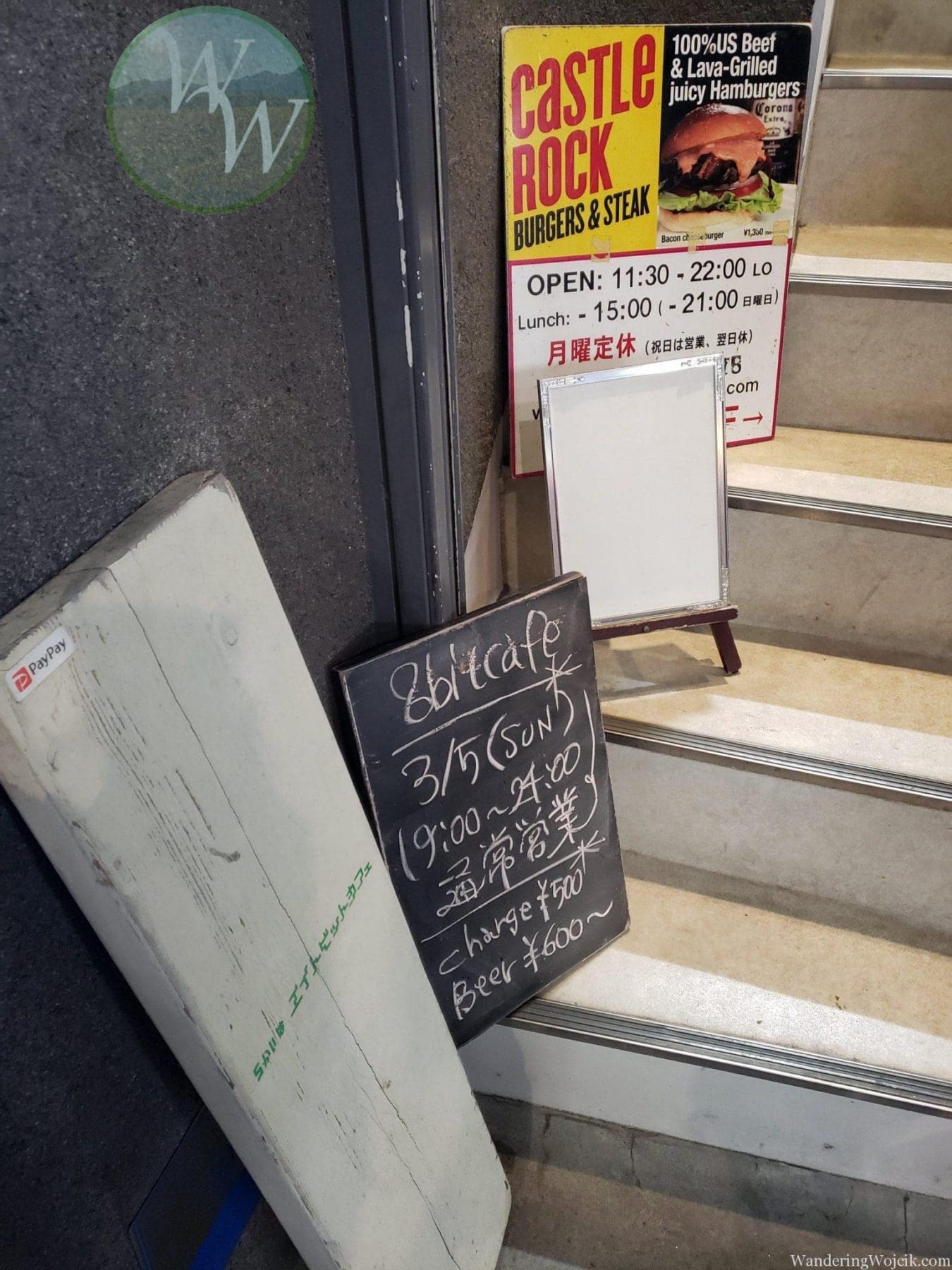 8-bit Cafe, located in the Shinjuku ward of Tokyo, is an unassuming establishment. There are no eye-catching signs or banners to draw attention. Instead, a small chalk board placed outside a staircase amid other colorful signs advertising different shops in the same building is the only outside indicator of it’s existence.