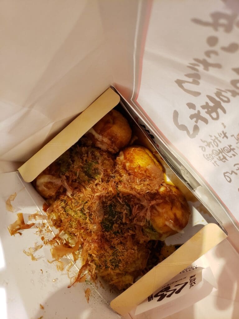 We waited in line and placed an order for a box of takoyaki. We had the option of eating inside or taking it to go. Without thinking, I said we’d take it to go. My reasoning was we’d be able to eat and walk in order to get the most out of our trip. What I failed to realize is that takoyaki is not exactly a handheld food….