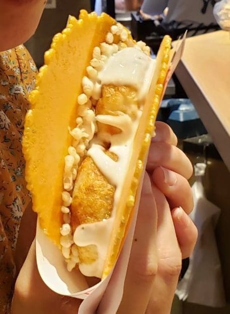 Despite only mildly enjoying the takoyaki, I was willing to give it another shot. Being the specialty of Osaka, there’s no shortage of options, so it was a bit overwhelming deciding which one to go to. We found a small shop that not only sold takoyaki, but put takoyaki in a taco shell to make it a handheld treat (a “Takoyaki Taco, if you will). Intrigued, we placed an order for two, and decided to eat inside the establishment this time (despite the portability).