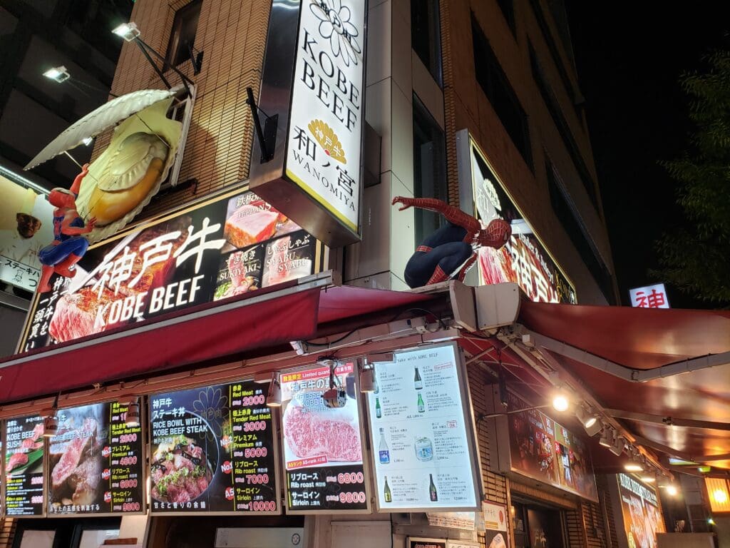 We walked further down the road and saw more vendors selling similar items (takoyaki, ramen, fried goods, etc). What caught our attention was a place selling ‘kobe beef’. The building itself was quite decorative, and included a couple of familiar faces.