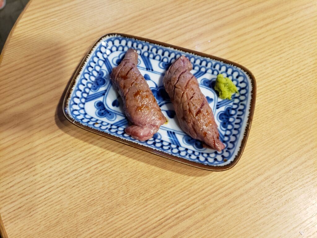 We looked at the menu and decided to get some Kobe beef sushi (Kobe beef on top of rice). The fun part was before the staff handed us the food, they whipped out a mini blowtorch and blasted the beef. They finished by dabbing it with some special sauce.