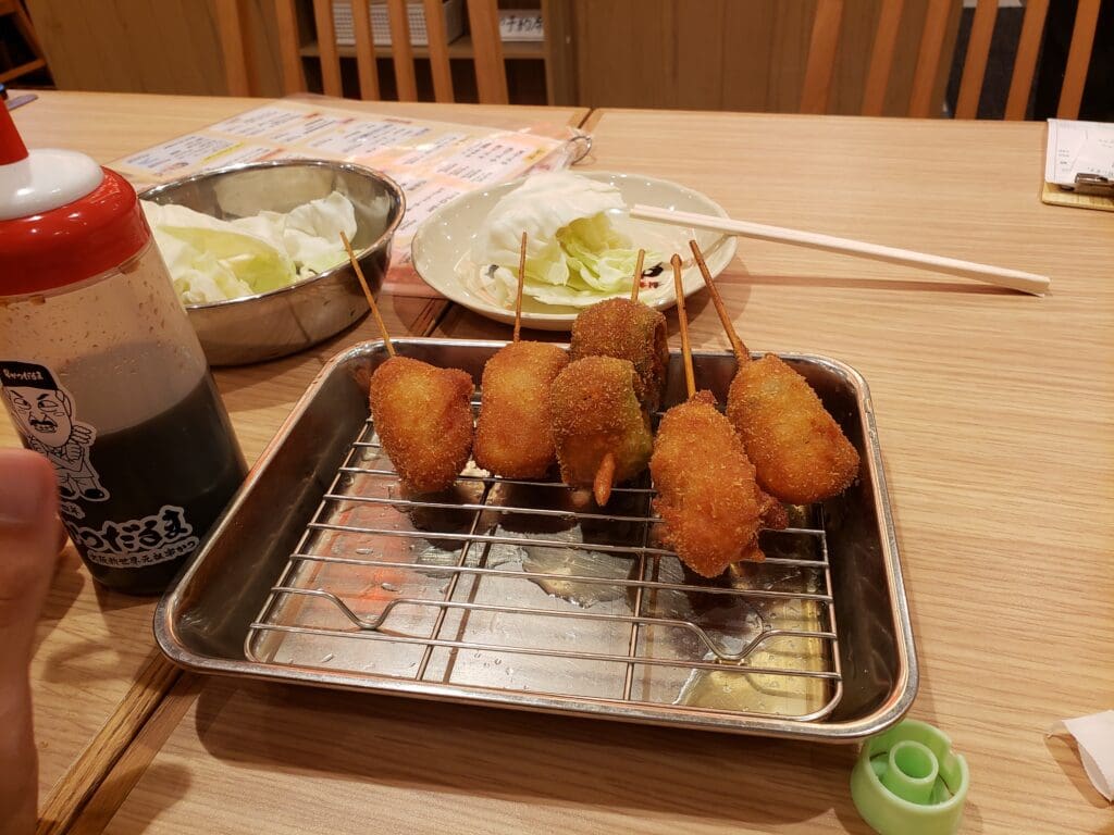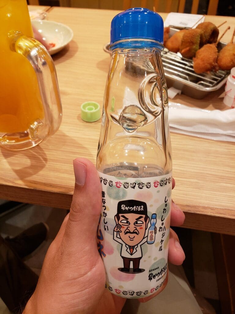 We tried an assortment of different fried goods. I can’t recall everything, but they offered several kinds of meats and vegetables, all of them delicious. I even got to try some ‘Lamune’ featuring our friend from out front. (Lamune is a popular Japanese soft drink that typically comes in a special glass bottle)