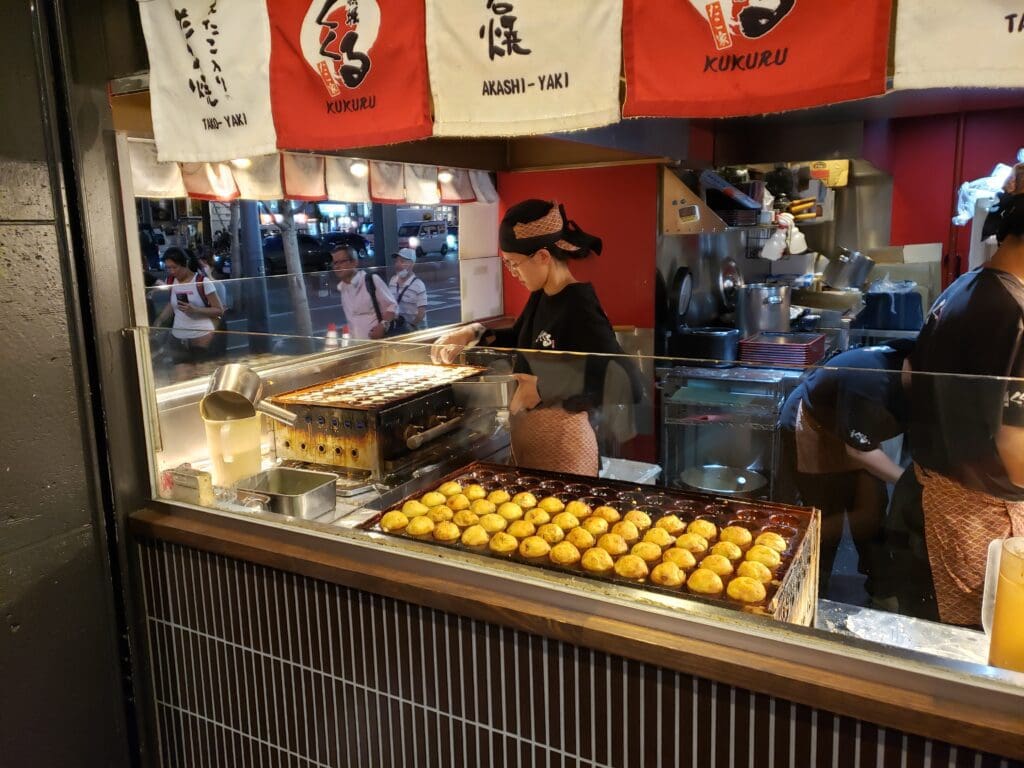 We decided to begin our venture by trying the most well known food in Osaka: Takoyaki. Takoyaki is octopus formed into balls, which are then fried and covered in sauce and fish flakes. Though we don’t normally eat octopus, we couldn’t leave Osaka without doing so.